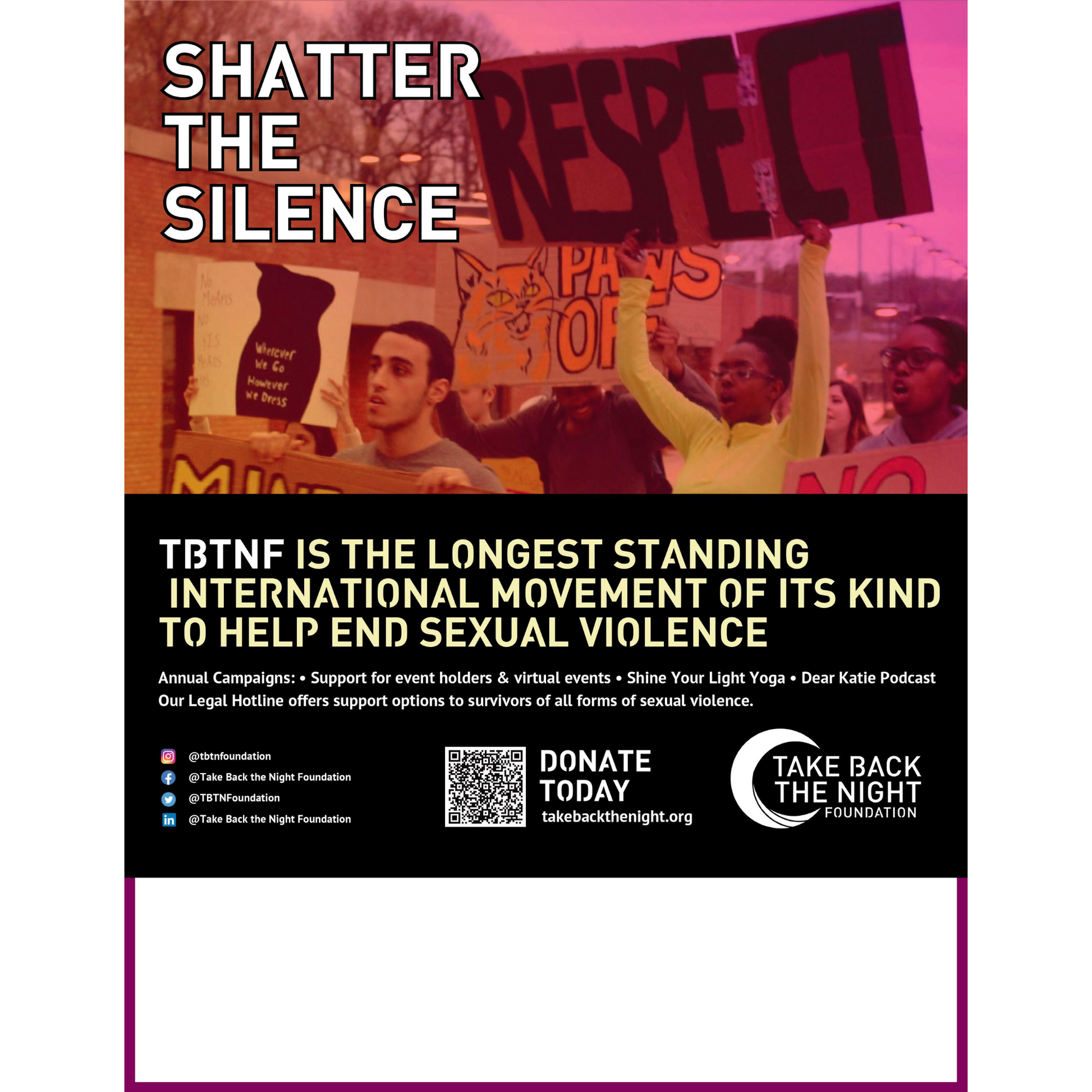 TBTN Events support the mission of ending sexual violence in all forms, raising awareness about sexual violence and supporting survivors of sexual violence.